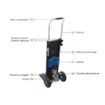Su batería portátil garantiza autonomía y libertad de movimiento, mientras que los botones de dirección permiten subir o bajar escaleras con un simple toque. Además, el botón de velocidad ofrece control total, adaptándose a las necesidades del operador y al entorno.